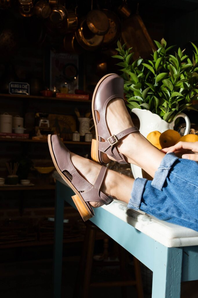 A modelo está usando o Sapato Boneca CITRINO – Chocolate e Madeira