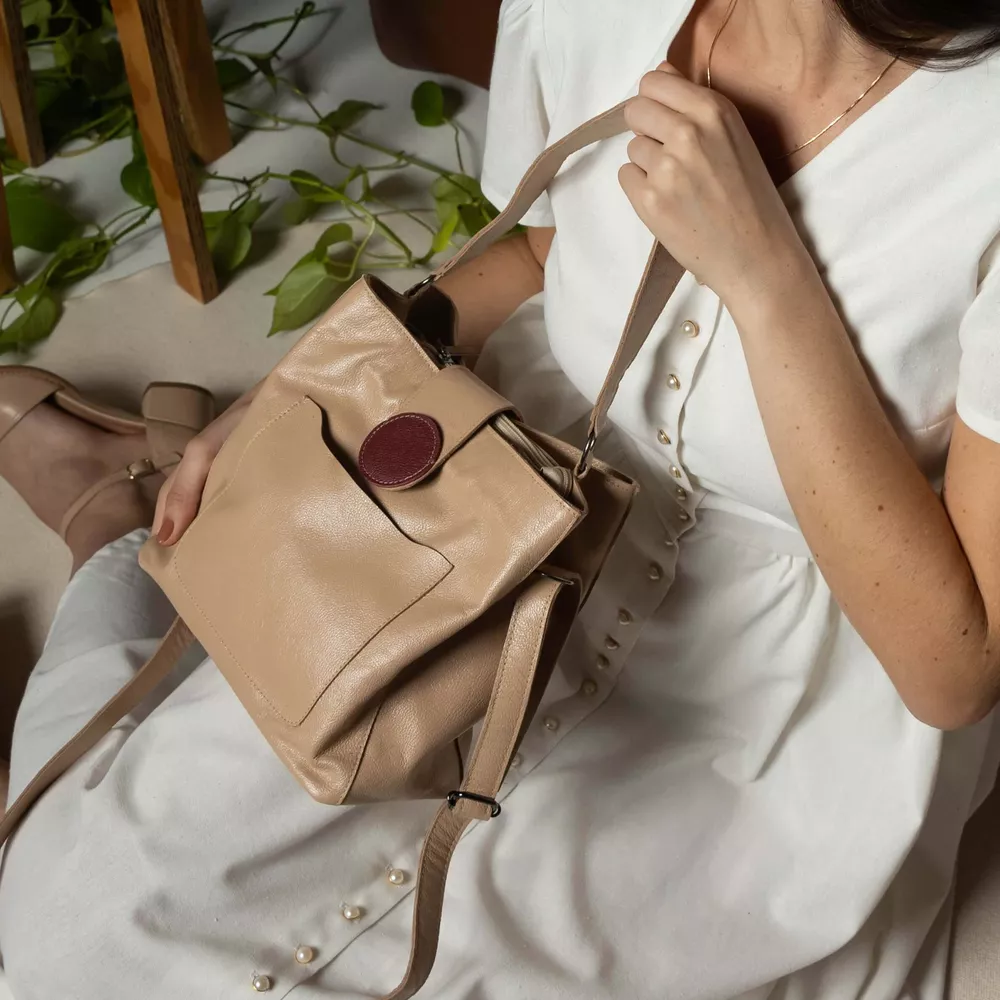 A modelo está usando a Bolsa RetrÔ – Nude e Chilli – VERBENA